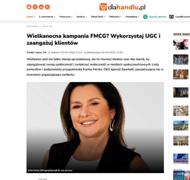 Wielkanoc to czas, kiedy nie tylko konsumenci, ale także marki mają swoje „świąteczne” wyzwania. To doskonała okazja do zwiększenia sprzedaży, ale także do zaangażowania swojej społeczności w działania promocyjne. W 2024 roku Polacy planują wydatki na zakupy świąteczne na poziomie 568,8 zł. To oznacza, że Wielkanoc to jeden z najważniejszych okresów sprzedażowych w roku. Karina Hertel – CEO SparkyB udzieliła wypowiedzi Dlahandlu.pl o tym jak realizować skuteczne kampanie wielkanocne.